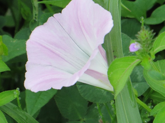 これは畑ではなく、ため池の側のため池側の道脇に咲いた花で、畑で繁茂するヒルガオより花が大きく美しく見えた(ハマヒルガオ?)。畑のヒルガオは白い地下茎を高スピードで伸ばすが、スギナのように地中深くには潜らない。純白の地下茎を見つけて取り除く作業に私は熱中し易い、数十分これに没頭することがある。その私が管理する畑でも除草剤を使わなければ絶滅は不可能だろう。地下茎を1cmでも取り残すとそこから芽を出し地下茎を急速に伸ばして繁茂する。