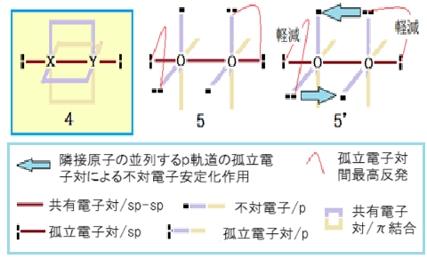 その概念を二本の青塗り矢印(5’)で表した。これが「隣接原子の並列するp軌道の孤立電子対によるp軌道の不対電子安定化作用」を表す。この作用で不対電子の安定化が実現する。そして安定化エネルギーに比例した原子内での孤立電子対間の反発軽減が実現する。つまり、孤立電子対が不対電子を安定化すると、不対電子の安定化に比例して孤立電子対性を失う、と言える。これで不対電子の安定化と孤立電子対間の反発軽減の両方が同時に実現する。