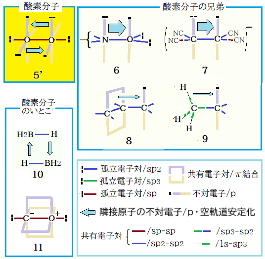 この緩めた表現に当てはまる「酸素分子の兄弟・いとこ」は、6~11 がある。6 は超安定なニトロキシドラジカル、7 はテトラシアノエチレンラジカルアニオン、8 はアリルとアリールメチルラジカル、9 は超共役による安定化だ。10 は三中心二電子結合のジボラン、11 は配位 π結合が実現した一酸化炭素である。5‘ ~ 7 はp軌道上の不対電子が隣接原子のp軌道の孤立電子対で、8 , 9 は共有電子対で、10 は異なる原子団間で空のp軌道を互いの共有電子対で、11 は空軌道が隣接原子の孤立電子対で安定化(配位 π結合)される。