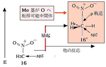 ニトロメタン(16)の亜硝酸メチル(17)への異性化が起こらない理由はもう一つある。異性化反応の活性化エネルギーがHに比べてMeでは格段に大きいこと予想されることだ。Hは原子軌道の半分を暴露しているがMeのCはHの鎧をまとって完璧に保護されている。脂肪族置換反応機構から考える。Cの軌道を暴露する一法はCがsp2混成状態(16’)に励起され、C-N結合のC側がp軌道に変らねばならないのだ。このレベルまで励起される前に16は他の反応を起こす可能性が高い。