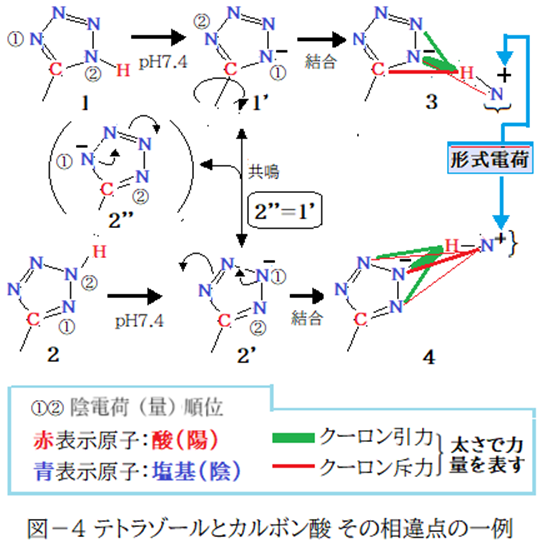 酸性原子団としてテトラゾールが使われることがあるが、カルボン酸との違いは異性体の存在である。私の解釈ではテトラゾール単独では陰電荷量1位と2位が離れ且つ陰が陽を挟んだ構造(1)がH体・陰イオン体共に安定と解釈。2,2’は陰電荷量1位と2位が隣に存在し陰・陰の反発力*が大きく不安定。環が陰イオンになっても1位・2位が逆転するだけで双方の位置関係は変わらない。前項(Ⅱ)で紹介した、私が思う三原子以上から成る原子団の安定化要因:「陰と陽は交互に在るのが安定」に反しているのが2,2’だ。しかしこの不都合状態は共鳴で解消(1=2‘’)できる。
