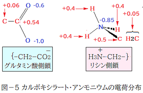 塩基性アミノ酸のリシン側鎖は体液中ではプロトン化され酸性基になる。酸性アミノ酸のグルタミン酸側鎖はカルボン酸の水素原子がプロトンとして脱離しカルボキシラートとなって塩基性基になる。両アミノ酸側鎖の総電荷量は酸性側:+1,塩基性側:-1である。しかし構成元素の電気陰性度の違いから両側鎖の内部も陰陽に分かれる。下図は100%私の主観で陰陽の電荷分布(図―5)を表した。結合する場合は、リシン側鎖では軌道(1s)が半分むき出しの三つの水素原子の何れかが主役となって結合する。グルタミン酸側鎖側は、カルボキシラートの陰電荷量が多い方の酸素原子が主役となって結合*する。その結合を緑の太線(図―3・4)で表した。その際、カルボキシラートの中心炭素原子、アンモニウムの中心窒素原子は結合を阻害するが、クーロン力は、「双方の電荷の積に比例し距離の二乗に反比例」だからカルボキシラートとアンモニウムの結合は成立する。