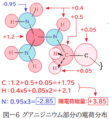 これも私の主観でアルギニン側鎖のグアニジニウムイオン部分の電荷分布を図-6で描いてみました。この画像では色の濃さで陰・陽の電荷量を表しています。グアニジニウムの中心炭素原子と三つの窒素原子は全てsp2混成状態である。中心の炭素原子はσ結合での陽電荷量とπ結合での陽電荷量の和は+1を超える。炭素原子と結合した一つの窒素原子は他の二つの窒素原子と陰電荷(量)が微妙に異なるはずだが、ここでは無視し、同等としている。