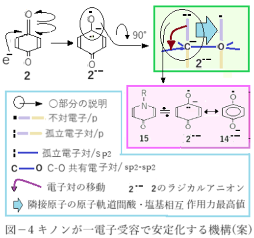 仮に一電子受容の位置が変わった場合(図-5)を考える。これまでは全てカルボニルC原子受容で考えた。2のごとく対象型キノンではカルボニル以外のC原子は全て等価なのでどこに一電子を受容しても同である。カルボニルC原子以外で受容(2’--)すれば隣接原子の原子軌道間酸・塩基相互作用による安定化力はカルボニルC原子の場合に比べてはるかに弱い。それ故にカルボニルC原子に電子対が移動したラジカルアニオン(2--)に変化する、と解釈する。
