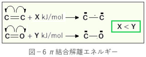 理由の一つはπ結合エネルギーだ。一酸化炭素・キノンの場合はカルボニル(C=O)のπ結合を解消することで一電子を受容する。しかしテトラシアノエチレンの場合はエチレン(C=C)のπ結合の解消だ。カルボニルのπ,σの両結合は分極によるイオン結合が加わる分結合エネルギーが大きく(図-6)なる。この結合解離エネルギーは電子親和力に対してはマイナスに働くので、C=OよりC=Cの方が有利となる。・・・①