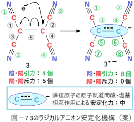 三つ目は一電子受容が実現した場合に付属して起こる現象だ。キノンの場合は6π電子系と隣接原子の原子軌道間酸・塩基相互作用が実現し前述の「一石二鳥」が実現する。これに対してテトラシアノエチレン(3)の場合は「陰と陽は交互」が実現(Ⅱ-5参照 / 図-7)する。図-7には記してないが陰・陰による斥力はテトラシアノエチレン(3)・テトラシアノエチレンラジカルアニオン(3--)共にゼロである。しかし3では陽・陽の反発結合部位が5個あることで電子を呼び込み易くなっている。3が電子一つ取り込むだけで陽・陽反発状態の結合が5個全て消滅し、「陰と陽が交互」による安定化の「場」が4個から8個に増える。・・・③
