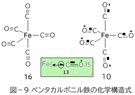 この安定化は私が主張する「隣接原子の平行するp軌道間酸・塩基相互作用」である。本安定化作用は電子対(塩基)を収容した軌道の電気陰性度が低いほど強塩基となる。ラジカル(酸)を収容した軌道の電気陰性度は高いほど強酸となる。強酸と強塩基の相互作用は大きな安定化が実現する。「超」安定ラジカルと言われるニトロキシドラジカル化合物群(Ⅰ-6)では塩基が中性N原子の孤立電子対で酸がOラジカルだ。本項での塩基はカルボアニオンの孤立電子対である。Cが中性でもNに比べれば電気陰性度が低い。ペンタカルボニル鉄でもCは電気陰性度の低い金属(鉄)と結合している。本項で取り上げたラジカルアニオンでは「超」3(超の3乗)安定ラジカルと言わねばならない。それ故に例えばペンタカルボニル鉄では16(図-9)のごとき化学構造式が与えられている場合が多い(一例:Wikipedia)。この構造式で多くの人たちが納得している? 仮に納得しているとすれば、その理由はペンタカルボニル鉄がラジカルの挙動を示さないからなのか? 「超」3安定なラジカルはラジカル特有の挙動が無い? 私はペンタカルボニル鉄の性質に関しては知見が無いのでラジカルか否かの言及はできない。 しかし化学構造式としての16は酸素原子が3価であるにもかかわらずプラスの形式電荷が付いてない。プラスの形式電荷をつければ5個のマイナス符号を付けるところが無い。この事態は酸素分子と似た状況と言える。これを解決する一法がここまで繰り返し述べてきたラジカル安定化の新概念:隣接原子の平行するp軌道間酸・塩基相互作用である