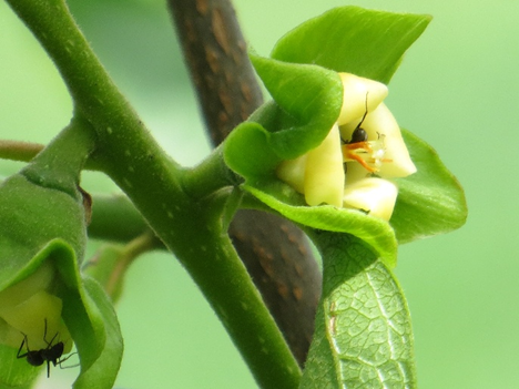 ヒトにとって柿の花は一番目立たない花では? と思う。ヘタの部分は既にできあがっておりそこにヘタより小さい花が付いている。この甘柿はよく着果して鈴なりとなる。しかし初夏と初秋に発生する「カキノヘタムシガ」の幼虫に食い荒らされ、生理落果と合わせて9割以上が落果する。