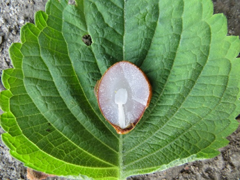 撮影は2022年9月13日だからカキノヘタムシガの幼虫に食害された果実の種と推定される。私の柿の食べ方は子供の頃から皮をむかずにかぶりつくので種の中を見ることはなかった。